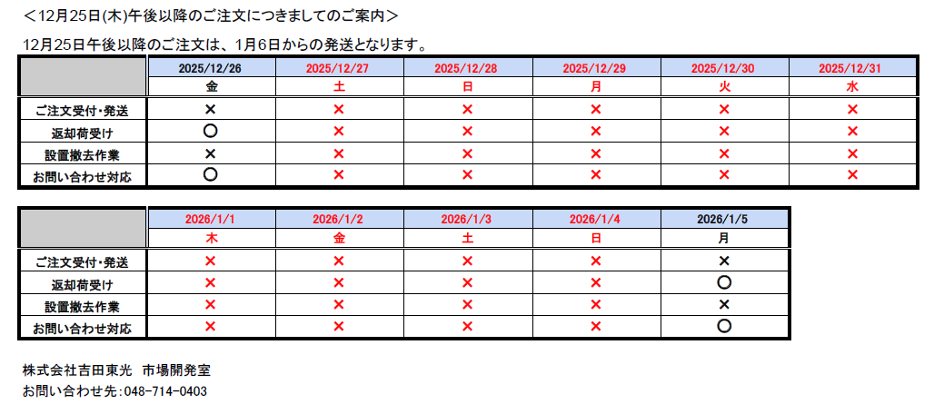 誠に勝手ながら、年末年始休業を2025年12月26日(金)~2026年1月4日(日)下記の通りとさせていただきますので、ご案内申し上げます。