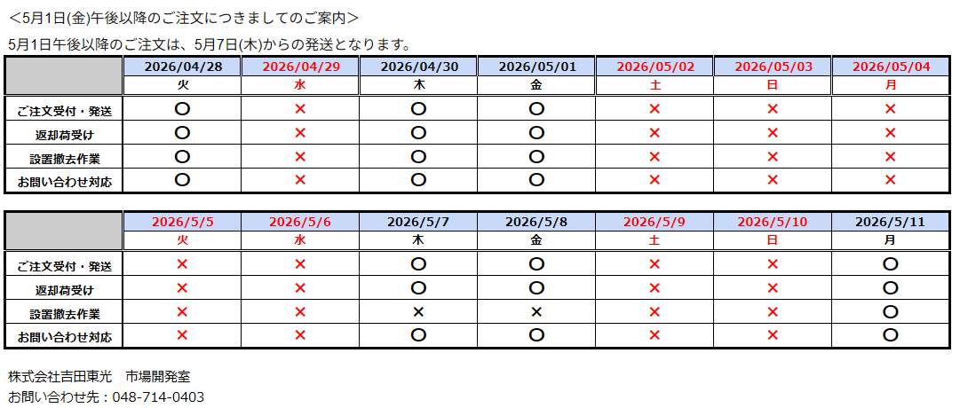 商品発送につきましてゴールデンウィーク期間は一部出荷、設置撤去作業をお休みさせていただきます。